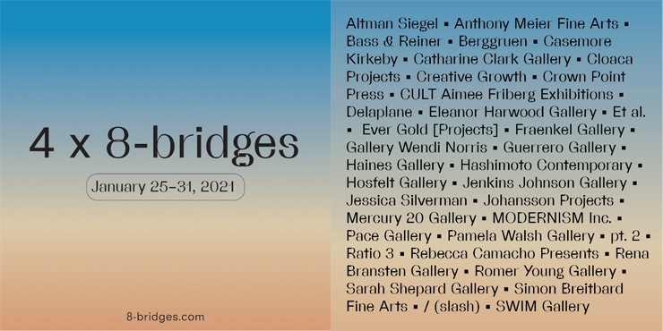In the tradition of San Francisco’s celebration of the visual arts in January, Mercury 20 Gallery is pleased to participate in 4 x 8-BRIDGES, an online art fair that includes thirty-six Northern California art galleries, each showing four works, as well as a series of talks, webinars, and video walk-throughs. We invite you to visit the site January 25-31, in support of our arts community. Here is the direct link to the Mercury 20 Gallery page ~ 8-Bridges
