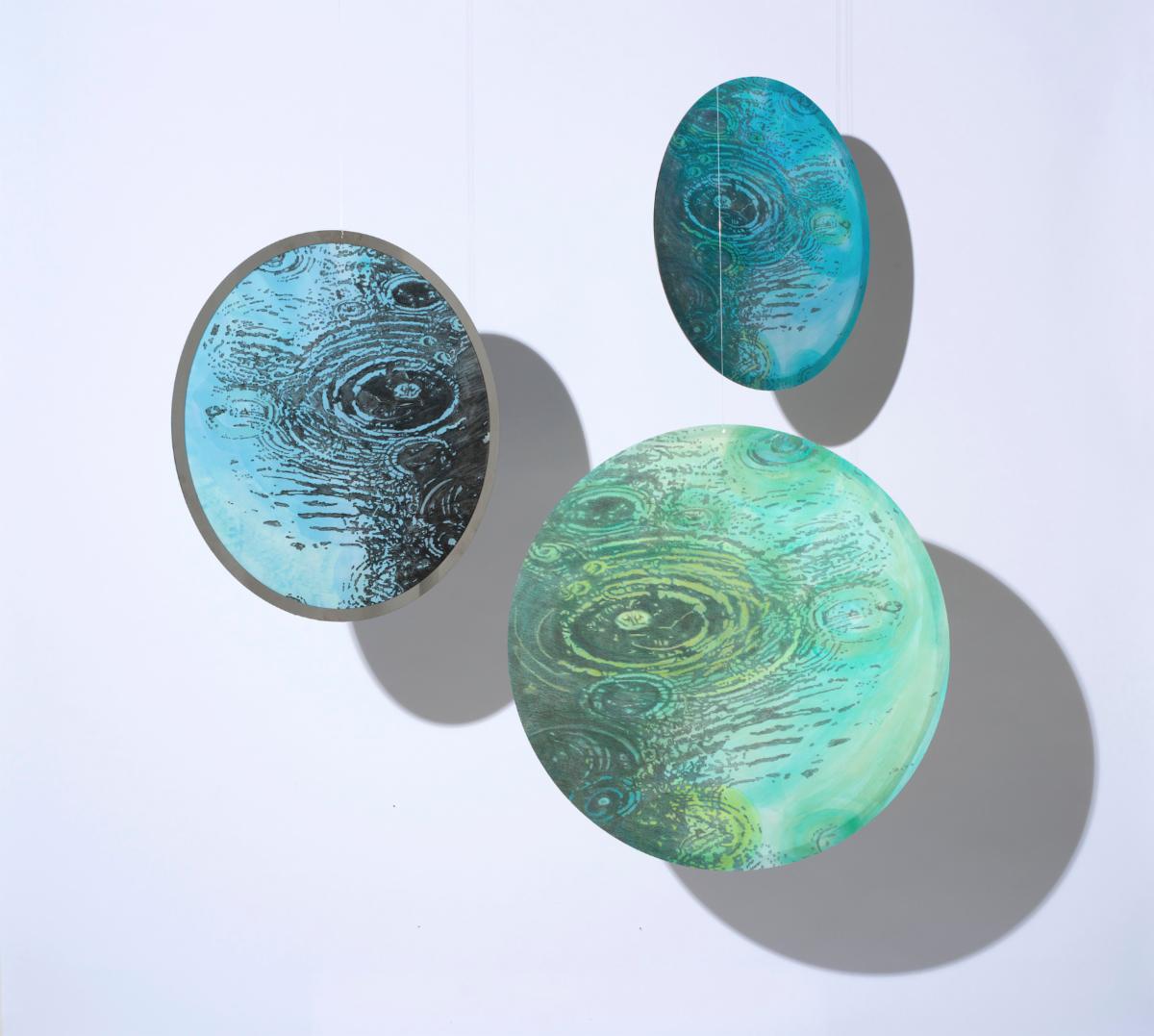 acrylic, colored pencil, Japanese ink brush pen and digital inkjet print on milky acetate, steel, monofilament