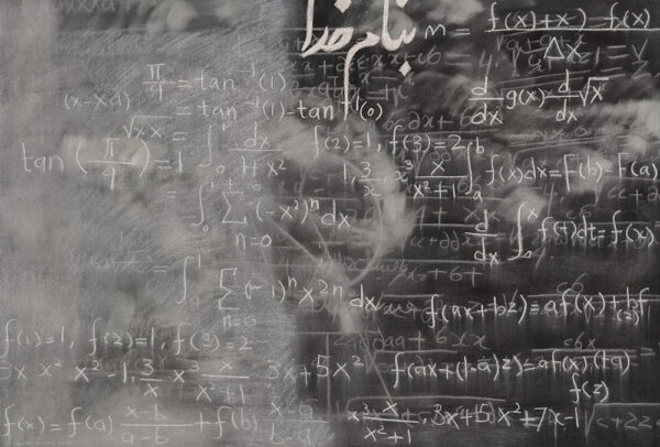 The blackboards’ interplay of cloudy chalk, Persian lettering, and math formulas — and their sequential morphing from clearly visible to almost nothingness — is a kind of visual existentialism. This aspect of the work is underscored by the dark boards’ setting: a cavernous, white-walled space.